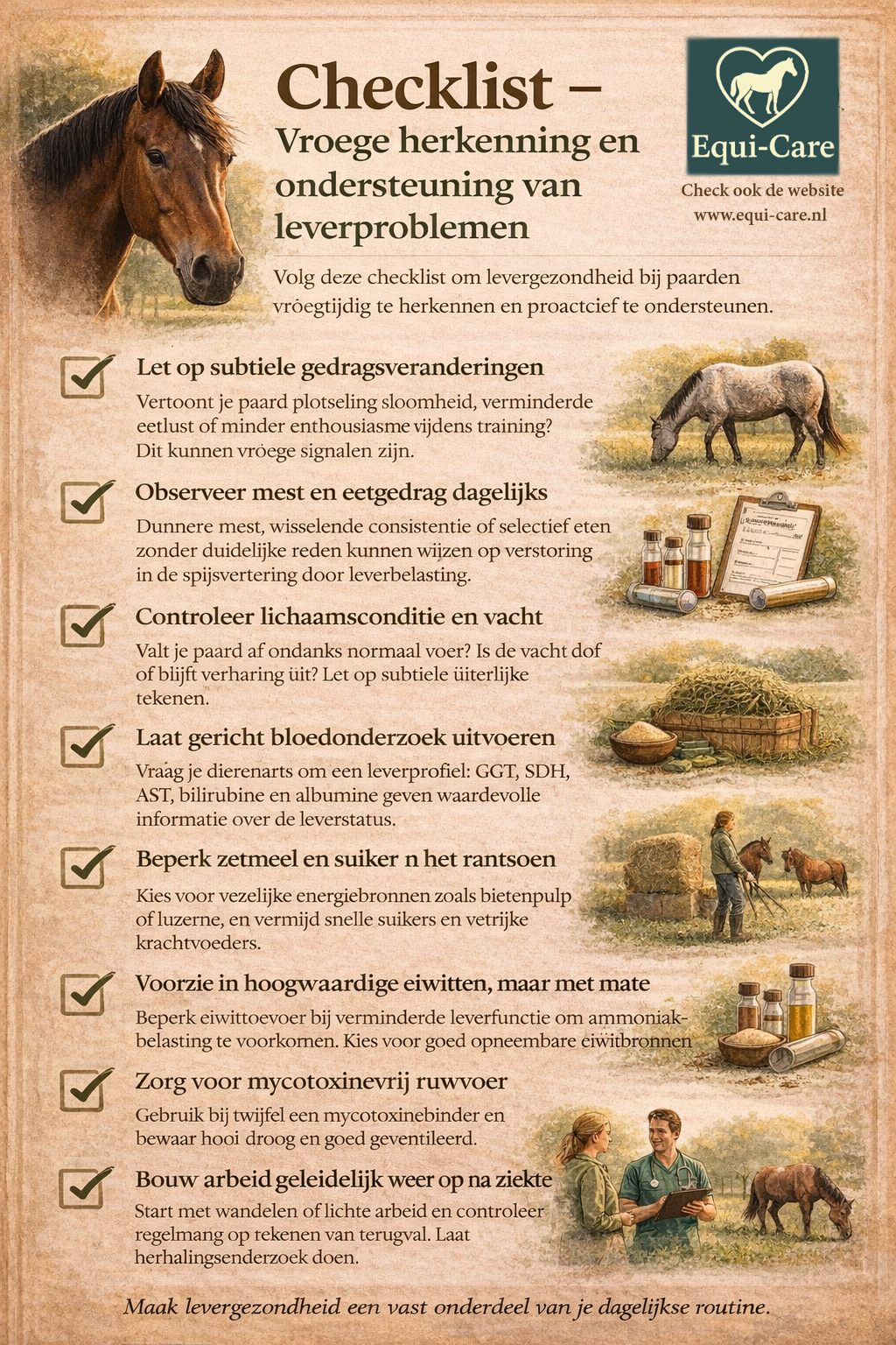 Een gezonde lever is cruciaal voor de stofwisseling, de hormoonhuishouding en het afvoeren van afvalstoffen. In de digitale gids Leverproblemen bij Paarden van Equi-Care leggen we uit wat de meest voorkomende oorzaken van leverbelasting zijn—van giftige planten in de wei tot een verkeerde balans in het rantsoen. We maken de vertaalslag van ingewikkelde bloedwaarden naar praktische acties. Zo leer je niet alleen wat er aan de hand is, maar vooral wat jij kunt doen om het herstelproces van je paard te versnellen.