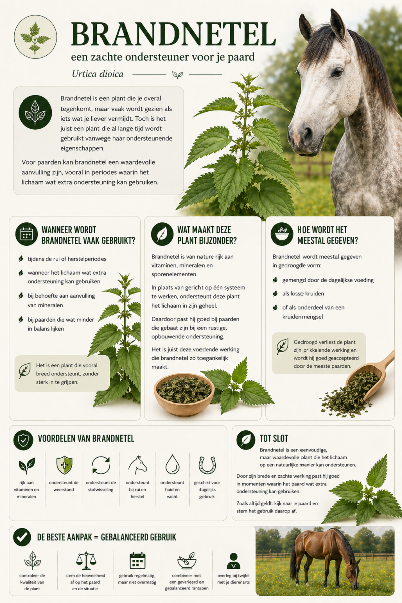 Voor paarden kan brandnetel een waardevolle aanvulling zijn, vooral in periodes waarin het lichaam wat extra ondersteuning kan gebruiken.