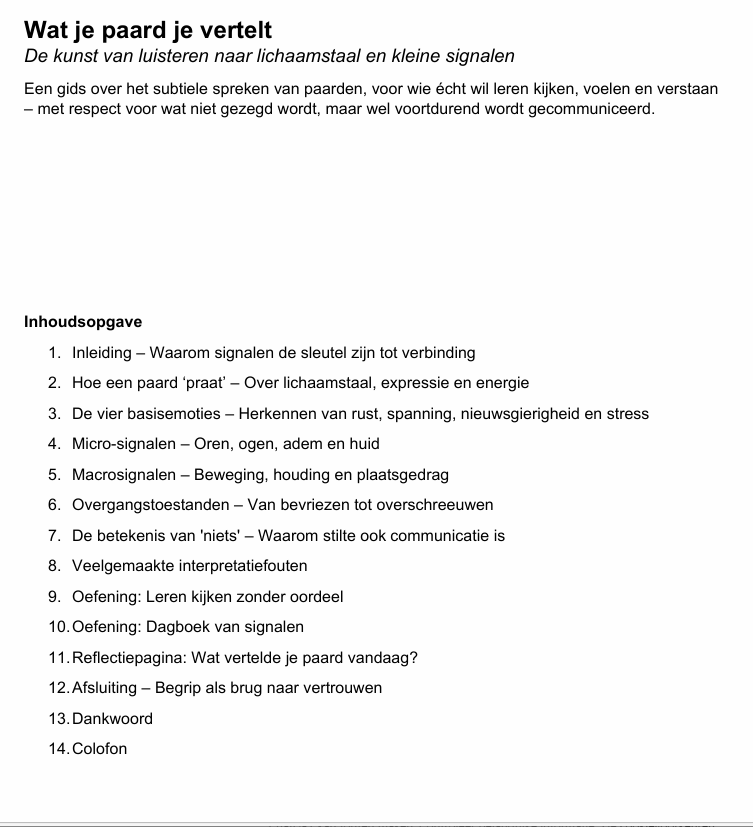 Deze gids Wat je paard je vertelt – De kunst van luisteren naar lichaamstaal en kleine signalen leert je kijken voorbij gedrag naar de emotionele laag eronder . Je ontdekt hoe micro- en macrosignalen samenhangen, hoe je overgangstoestanden herkent en hoe stilte óók communicatie is.