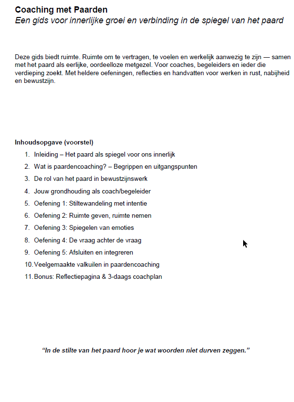 Deze gids Coaching met Paarden – Innerlijke groei en verbinding in de spiegel van het paard laat je ervaren hoe paardencoaching werkt als ervaringsgerichte methode voor persoonlijke ontwikkeling . Je leert hoe het paard emoties spiegelt, hoe jij als begeleider bedding creëert en hoe sessies worden opgebouwd vanuit rust, veiligheid en bewustzijn.