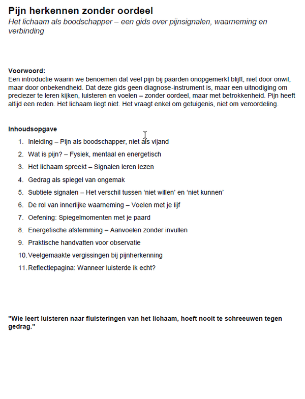 Voelt je paard ‘anders’? Merk je gedrag op dat je niet goed kunt plaatsen, of ervaar je spanning in jullie contact? Deze digitale gids helpt je om met een zachtere blik te kijken, en beter te luisteren naar wat je paard écht vertelt.