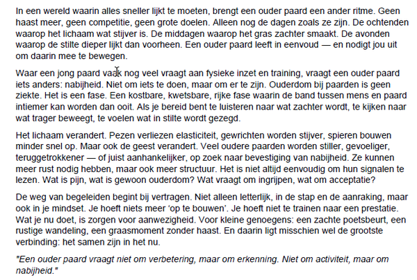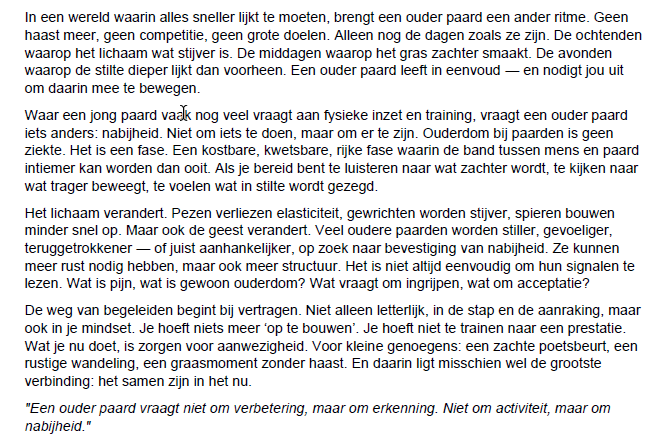 Deze gids biedt zachte ondersteuning voor wie zijn paard niet alleen wil ‘verzorgen’, maar werkelijk wil begeleiden. Voor wie durft te vertragen, te voelen, en trouw wil blijven — tot het allerlaatste moment.