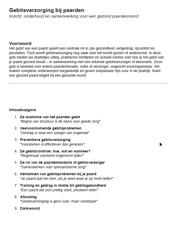 Gebitsverzorging bij paarden is een toegankelijke en complete digitale gids voor iedereen die wil zorgen voor een gezond paardenmond. Of je nu beginnende ruiter bent of ervaren paardenhouder, deze handleiding van Equi-Care geeft heldere uitleg over alles wat komt kijken bij goed gebitsbeheer.