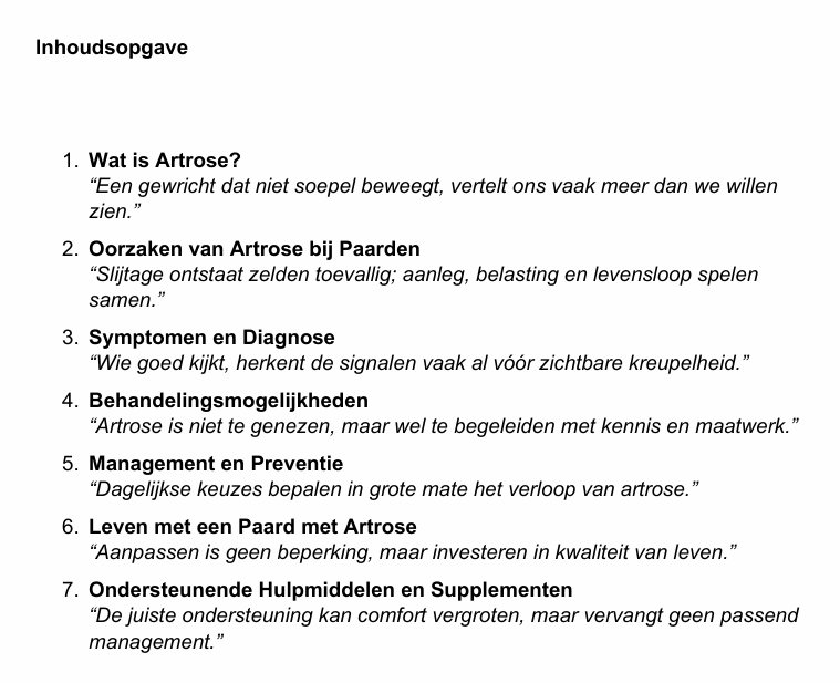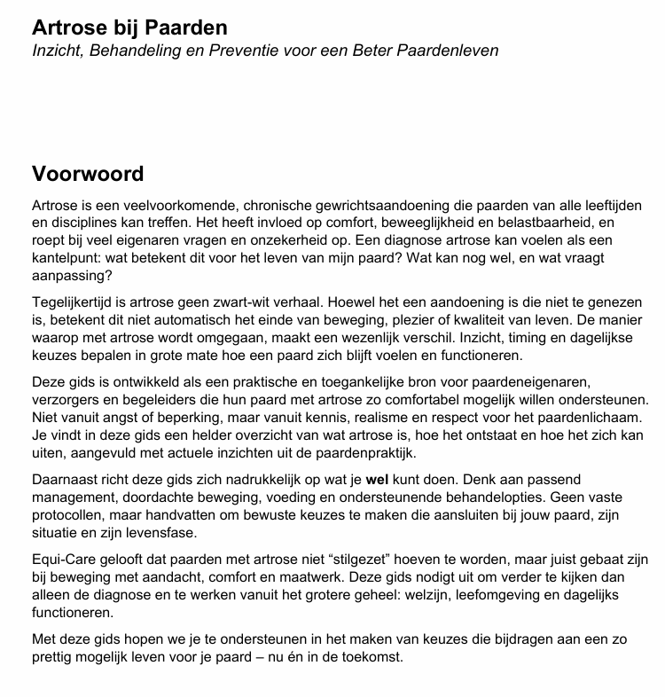 Deze gids Artrose bij Paarden – Inzicht, behandeling en preventie helpt je begrijpen wat artrose bij paarden is, hoe het ontstaat en hoe je comfort en bewegingsvrijheid gericht ondersteunt . Je krijgt praktische handvatten voor behandeling, management en dagelijkse aanpassingen bij een paard met artrose.