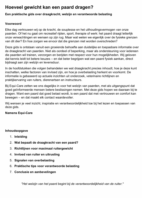 Deze gids Hoeveel gewicht kan een paard dragen? – Draagkracht, welzijn en verantwoorde belasting geeft je heldere richtlijnen en praktische handvatten om overbelasting te voorkomen . Je leert hoe je de 15–20%-regel toepast, welke factoren draagkracht beïnvloeden en hoe je signalen van overbelasting tijdig herkent.