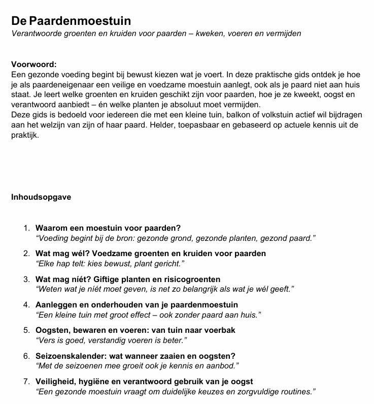 Deze gids De Paardenmoestuin – Verantwoorde groenten en kruiden voor paarden: kweken, voeren en vermijden geeft je een compleet en praktisch stappenplan van zaaien tot veilig voeren . Je leert precies welke planten geschikt zijn, welke giftig zijn en hoe je hygiënisch oogst en bewaart – ook als je paard niet aan huis staat.