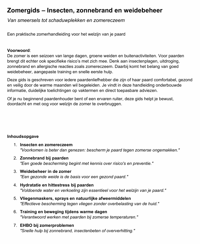 Deze Zomergids – Van smeersels tot schaduwplekken en zomereczeem geeft je een complete en praktische handleiding voor paardenwelzijn in de zomer . Van hittestress en hydratatie tot weidebeheer, vliegenmaskers en EHBO bij zomerproblemen: je krijgt direct toepasbare adviezen voor warme maanden.
