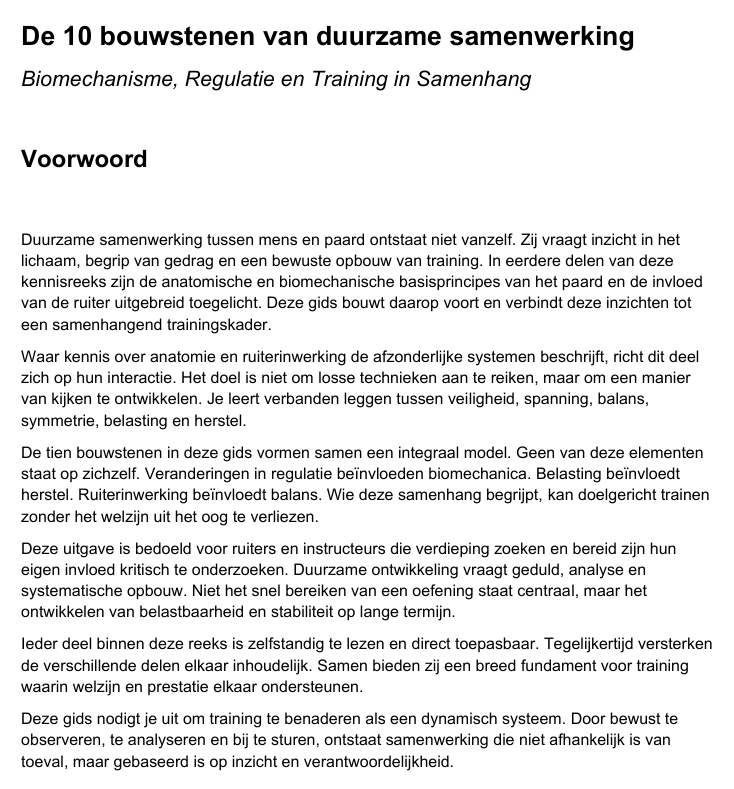 De 10 Bouwstenen van Duurzame Samenwerking is een praktische gids over biomechanica bij paarden, spanningsregulatie en logische trainingsopbouw. Je leert hoe veiligheid, draagkracht, herstel en ruiterinwerking samenhangen in één helder trainingskader.