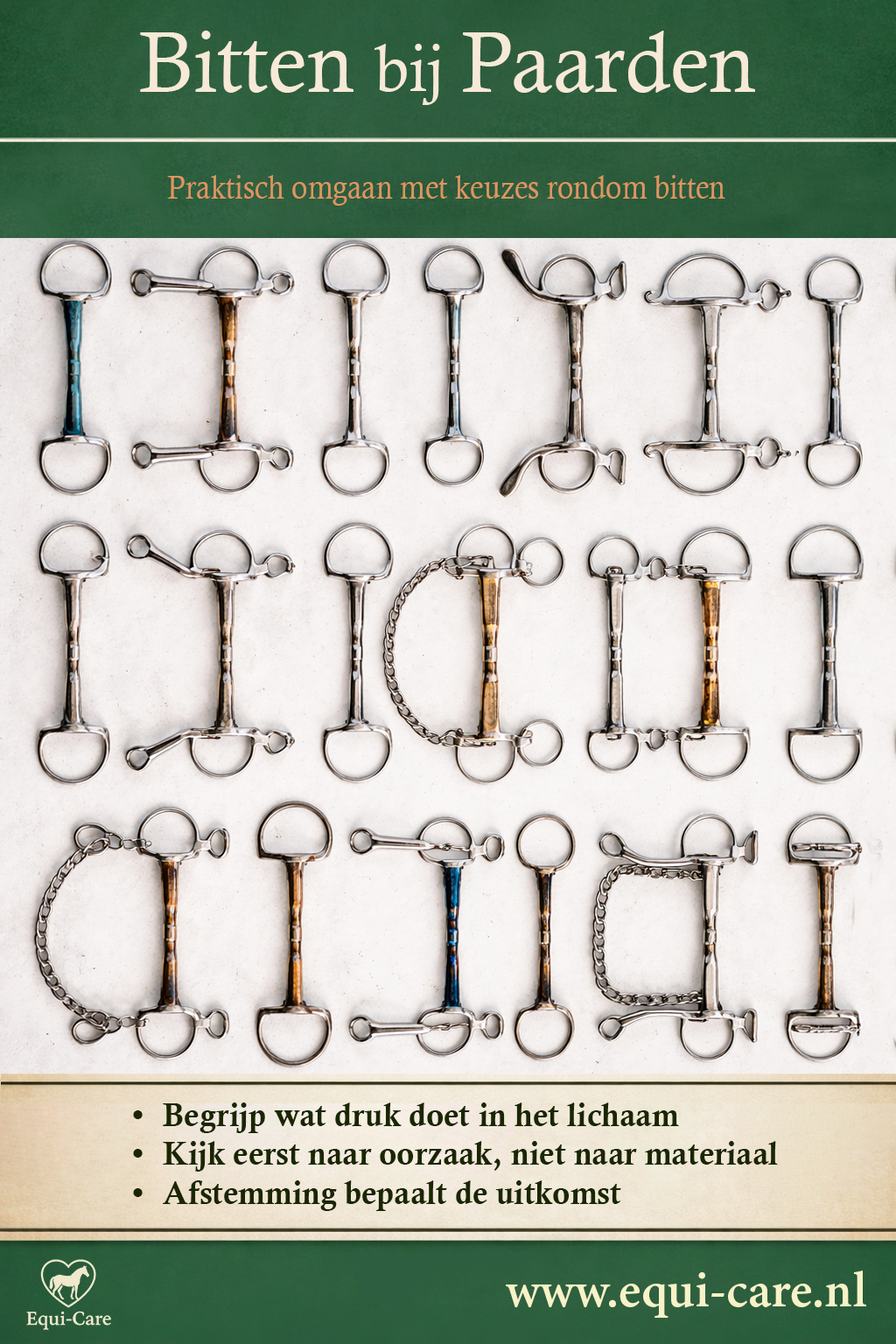Bitten bij Paarden is een praktische digitale gids over bitten, drukverdeling en communicatie tijdens het rijden. Je krijgt helder inzicht in hoe verschillende bitten werken en hoe je materiaalkeuze afstemt op je paard.