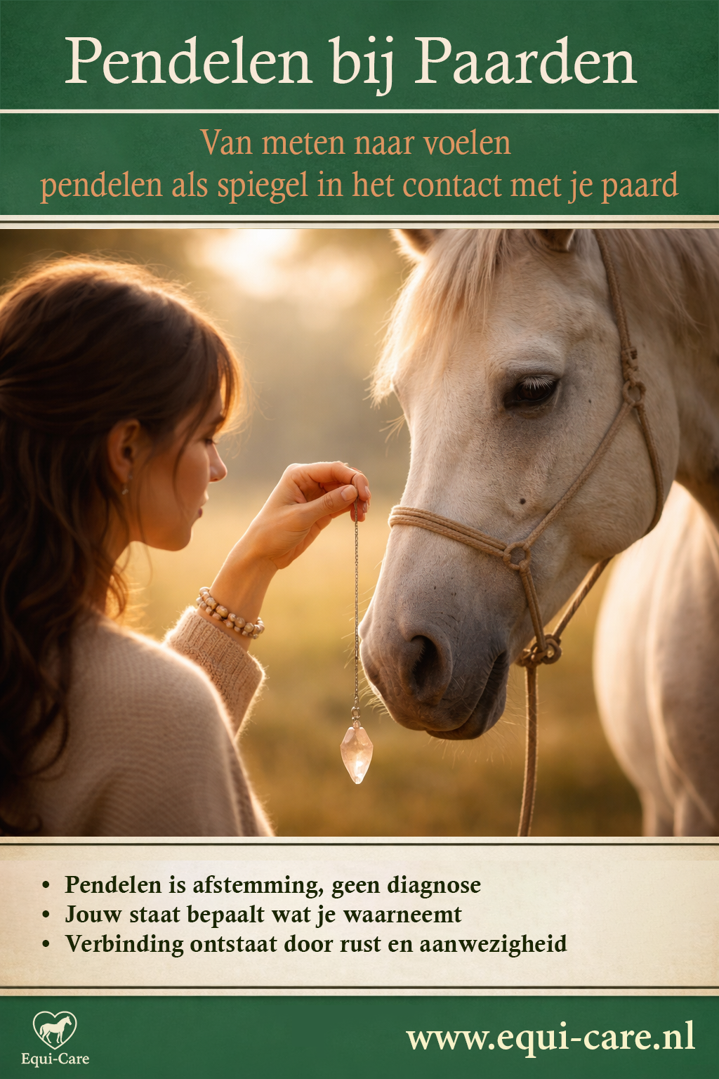 Deze gids over pendelen bij paarden laat je stap voor stap zien hoe je de pendel gebruikt als spiegel voor je eigen afstemming, zonder te sturen of te interpreteren.