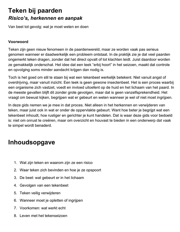 Deze gids is geschikt voor iedere paardeneigenaar die bewust wil omgaan met gezondheid en verzorging. Of je nu dagelijks met je paard werkt of vooral geniet van rustige momenten samen, deze informatie helpt je om met meer vertrouwen te handelen wanneer je een teek tegenkomt.